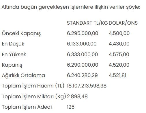 Tüm metallerin işlem hacmi toplamı ise 20 milyar 356 milyon 350 bin 362,89 lira olarak gerçekleşti. Bugün en yoğun altın işlemlerini gerçekleştiren kurumlar arasında Vakıf Katılım Bankası, NMGlobal Kıymetli Madenler, Ziraat Bankası, Kuveyt Türk Katılım Bankası ve Uguras Kıymetli Madenler yer alıyor.